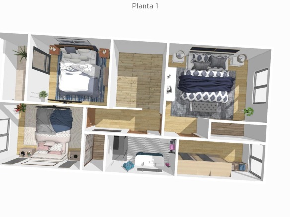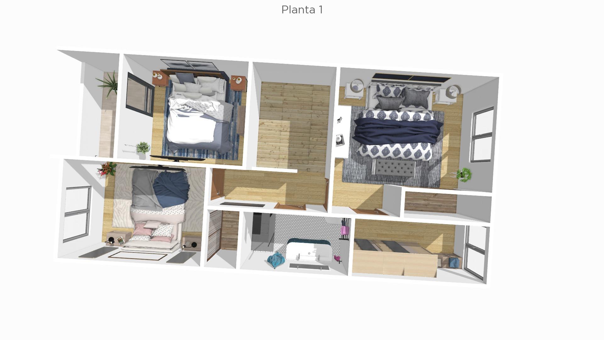 En la planta primera, encontramos tres dormitorios doble, terraza exterior, un baño equipado con bañera, y el cuarto de plancha y almacén.